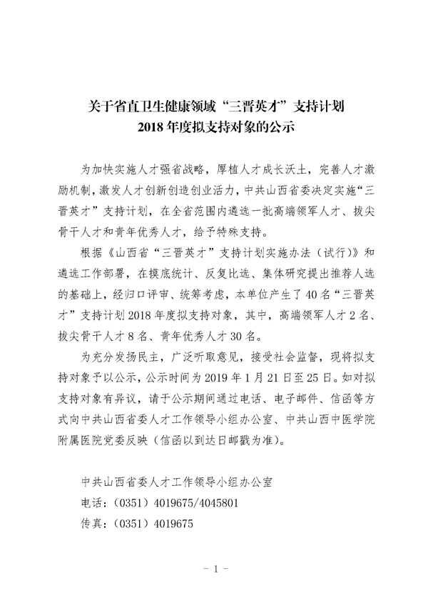 关于省直卫生健康领域“三晋英才”支持计划 2018年度拟支持对象的公示