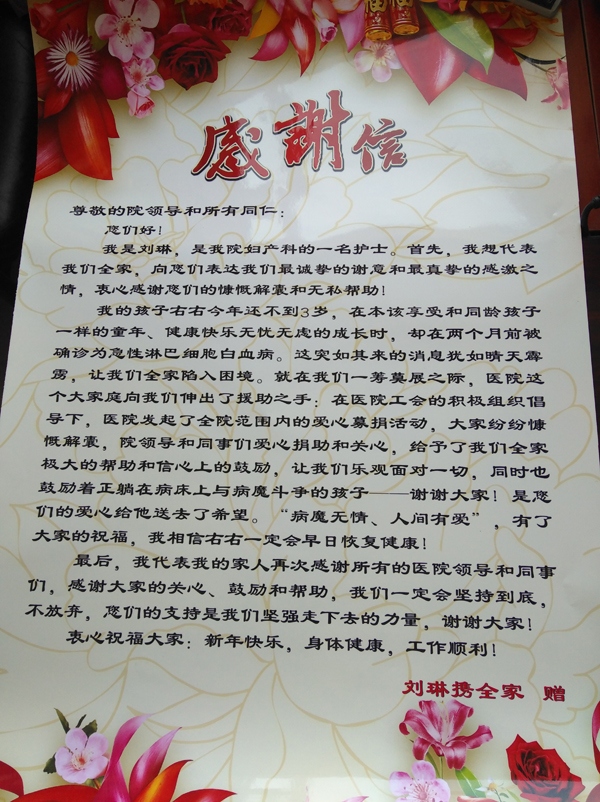 捐款信息已在医院工作群和公示栏公示。在此,谨代表患者家人向所有奉献爱心的同事们、朋友们致以最诚挚的谢意!谢谢您们!