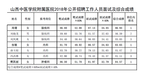 山西中医学院附属医院2018年公开招聘工作人员面试及综合成绩