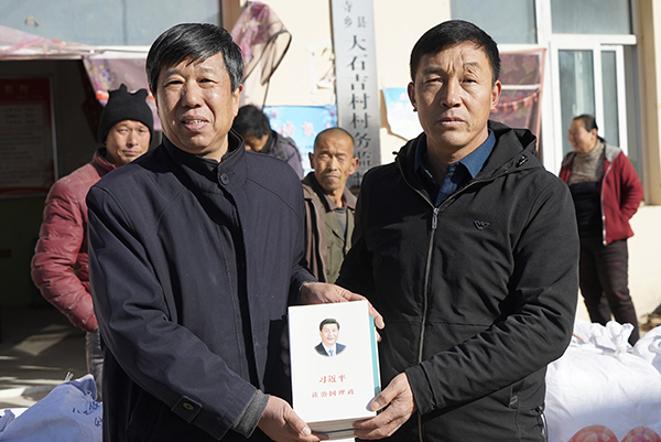 乔甲荣到来后,为了帮助大石吉村民温暖过冬,跟院领导汇报后,东京热 党委书记夏耀林、副院长武登龙带队赴村向村民捐赠爱心物资。短短一周时间,东京热 职工积极响应,募集了成人衣物596件、儿童衣物200件、课外读物309册,以及五户五保户每户一份的米面油。在捐赠仪式现场,夏耀林代表东京热 党委向大石吉村党支部赠送了《习近平谈治国理政》等党的书籍,推动村级精神文明和物质文明建设的双丰收。