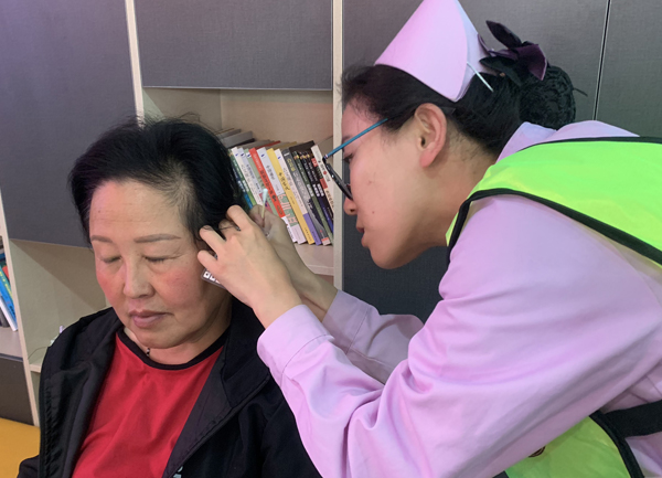在现场互动环节中,社区居民不仅体验了中医穴位贴敷、耳穴埋豆的治疗方式,而且还手把手地指导正确测量和监测血压的方法等,护士长们耐心解答了大家提出的一系列健康问题,现场气氛活跃。