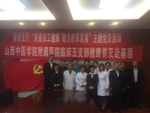 5月8日下午,东京热 临床五支部党员到中国工商银行清徐支行开展了以“为人民群众送健康”为主题的党日活动。本次活动由儿科、治未病科、男科、急诊、120急救中心的10余名专家组成,为工行50余名职工答疑解惑,送去健康知识。
