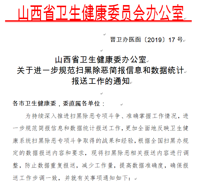 山西省卫生健康委办公室关于进一步规范扫黑除恶简报信息和数据统计报送工作的通知