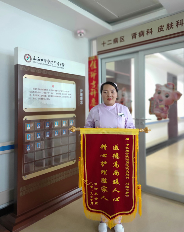 最近,一位皮肤科患者住院后,因患病,心情烦躁,不利于疾病的治疗恢复。面对这种情况,身为责任护士刘振华抱着“急病人所急,想病人所想”的态度,一方面主动和主治大夫积极沟通,了解病人的治疗方案。另一方面,主动和患者及家属进行解释。根据病情为患者制订了详细的护理计划和护理措施。面对患者的各种护理要求,刘振华护士总是想办法满足。在医生有效的治疗以及刘振华护士的精心护理下,患者的病情短时间内得到了好转,并逐渐地康复。刘振华护士专业的技能和精心的护理,使患者感到如春天般的温暖。在患者出院之际,特意向刘振华护士赠送了一面锦旗,锦旗上写到:医德高尚暖人心,精心护理胜家人。这面锦旗是对刘振华护士的肯定和鼓励,也是十二病区开展优质护理活动取得的又一项成果。