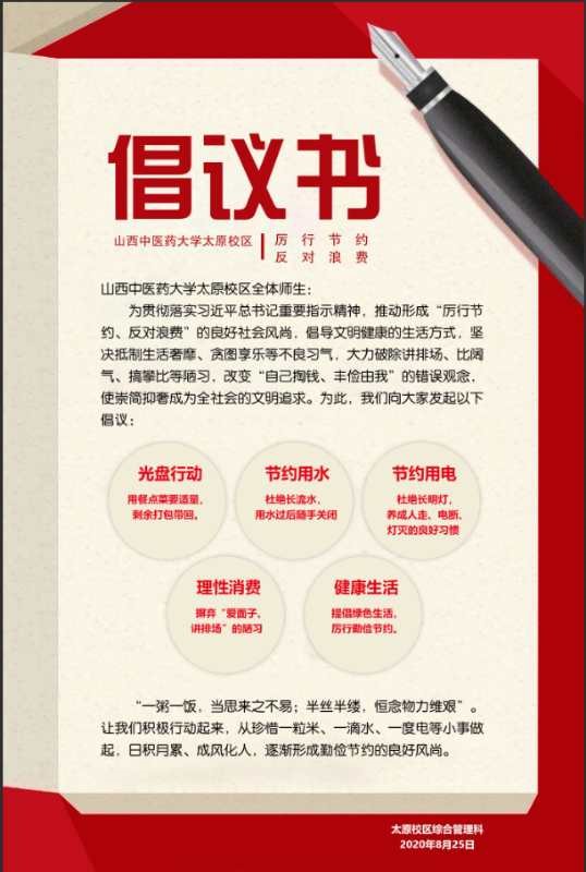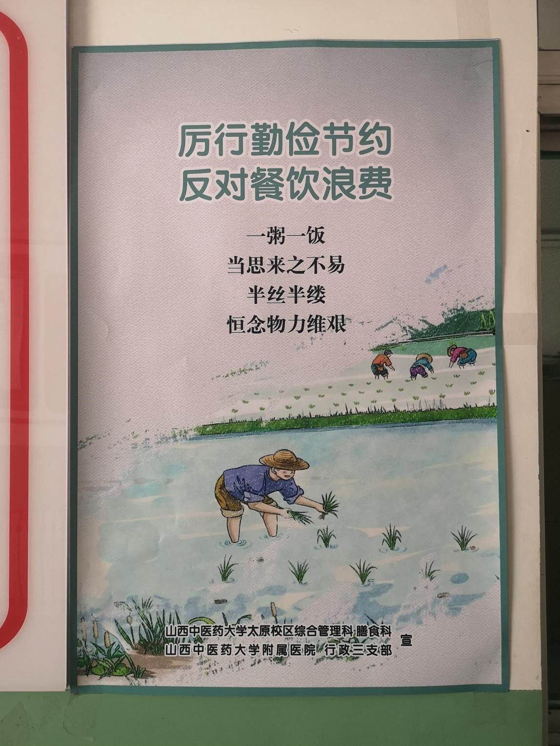 为贯彻落实习近平总书记重要指示精神,积极响应学校、附院倡议和号召,大力弘扬中华民族勤俭节约的优良传统美德,山西中医药大学太原校区综合管理科与膳食科联合发起“厉行节约 反对浪费” 倡议活动。