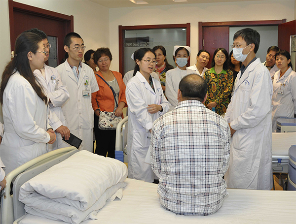 在周围血管病科病区,付滨教授观看了教学查房,并亲自在肾病科进行了教学查房示范。在点评时付滨教授指出,临床教学查房是医学实践教学的重要环节,是培养实习医师临床诊疗思维能力和临床实践能力的有效途径,要通过对典型病例的系统讲解、示范操作、分析总结,促进实习医师对病史采集、体格检查、病情演变与实验结果分析、疾病诊治等临床基本诊疗技能的掌握,锻炼其与患者的沟通技巧,最终要达到教学相长、提高临床教学质量和管理水平的目的。