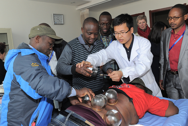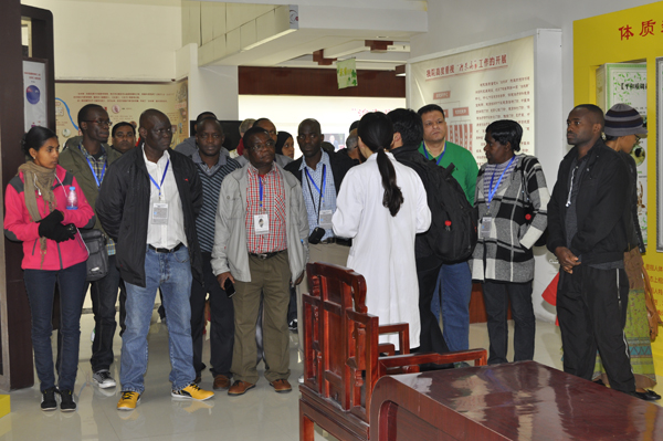 商务部非洲英语国家中医药官员研修班学员来东京热 参观 发布时间:2014年10月27日 来源:山西中医学院附属医院 作者:宣传科 10月24日上午,商务部非洲英语国家中医药官员研修班27名学员来东京热 参观学习。这批学员来自埃及、埃塞俄比亚、波黑等14个国家。党委书记夏耀林,院长助理李晓伟陪同。 学员们在针灸、推拿诊室进行实地学习。 随后他们参观了悦心园、中医治未病资讯园地、健康饮食文化园地、中药科普园地。