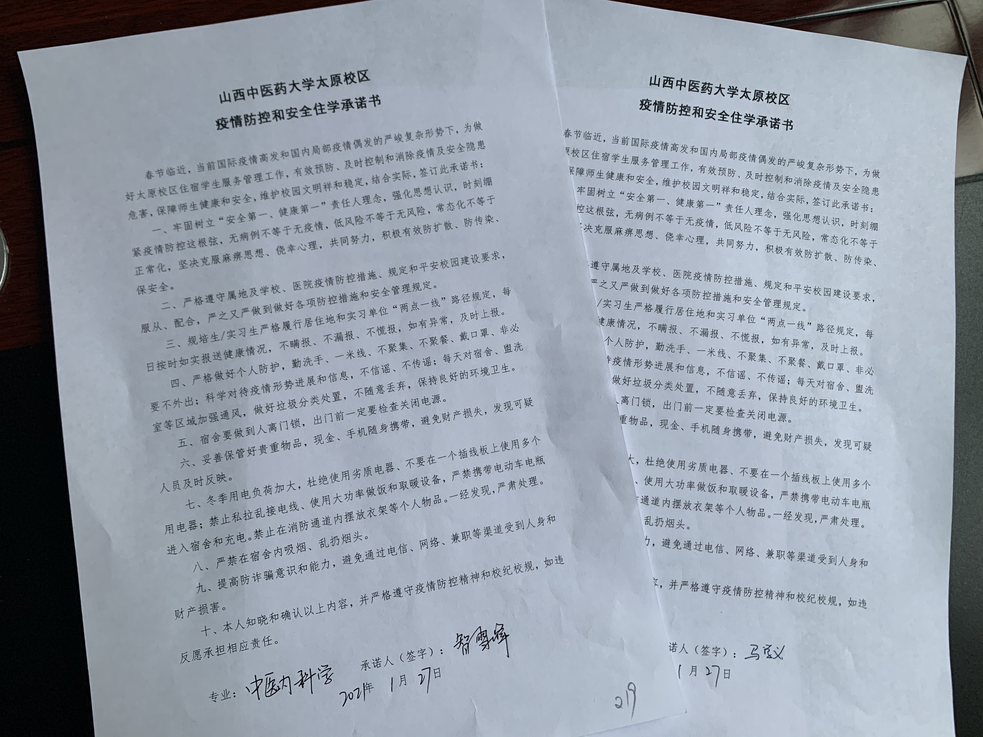 为进一步做好太原校区住宿学生服务管理工作,有效预防、及时控制和消除疫情及安全隐患危害。日前,太原校区结合实际,以问题和结果为导向,有的放矢,创造性开展工作,积极推进留宿学生“承诺书”制度,同心协力,全力保障师生健康和安全,维护校园文明祥和稳定。