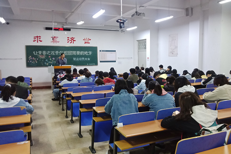 4月25日晚,第二临床学院在仁济书院甲座102教室召开“让青春之花开在祖国需要的地方”就业动员大会。学院学生科副科长赵国鹏主讲,16级毕业生参加。