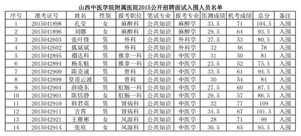 山西中医学院附属医院关于2015年度公开招聘工作人员考试入围面试人员的通知 发布时间:2015年5月13日 来源:山西中医学院附属医院 作者:人事科 各考生: 根据山西省人力资源和社会保障厅以及山西省卫生和计划生育委员会关于公开招聘考试入围面试的比例要求,现就入围面试人员名单通知附后,具体面试分组及面试时间、地点另行通知。 山西中医学院附属医院人事科 2015年5月13日