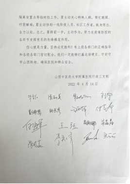 主题活动上与会人员就近期疫情防控形势的严峻性复杂性进行了分析研判,结合医院中心工作和主要任务踊跃发言。行政三支部向全体党员发出倡议,大家在倡议书上签字承诺,一致表示要用实际行动诠释入党誓词,当前疫情防控正处在最吃劲的攻坚期、关键期,我们每个人既是自己健康的责任人,又是他人健康的守护者。做好防护防控,既是对自己负责,也是对家人和社会负责。作为一名党员,一名医务工作者,要主动作为、迎难而上,戴党徽、亮身份、做贡献,做到守土有责、守土尽责,打赢疫情防控阻击战。