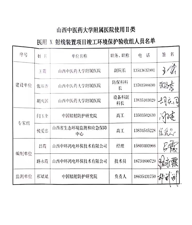会议期间,医院汇报了该血管造影机项目建设情况及环保措施“三同时”落实情况,验收监测单位介绍了项目验收监测情况,验收组成员查验了血管造影机使用场所。经认真讨论,形成验收意见如下:
