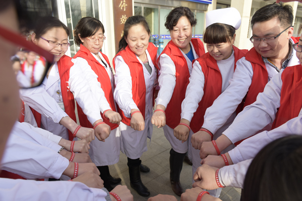 山西日报:山西中医学院附属医院“红手环志愿者服务团”成立 发布时间:2016年3月31日 来源:山西日报 作者:秦洋 3月下旬,山西中医学院附属医院医护人员组建的“红手环志愿者服务团”正式成立。服务团致力于为公众开展脑血管疾病防治相关的健康公益活动。随后,志愿者在医院脑病科门诊开展了“关注卒中,红手环在行动”义诊活动,并为公众举办了健康教育科普讲座,传播预防脑卒中健康知识。图为佩戴红手环的医护志愿者们在一起。