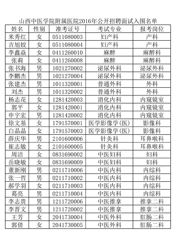 山西中医学院附属医院2016年公开招聘面试入围名单