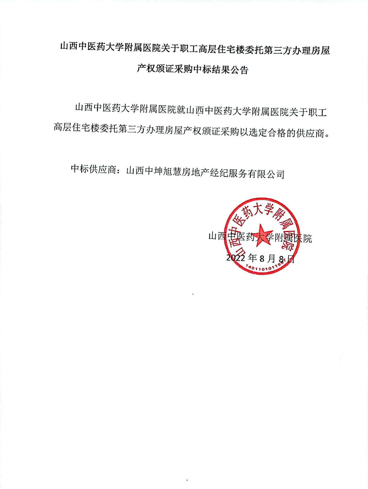 东京热 关于职工高层住宅楼 委托第三方办理房屋产权颁证采购中标结果公告