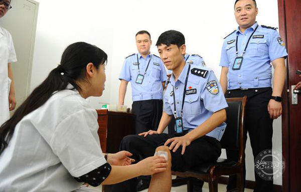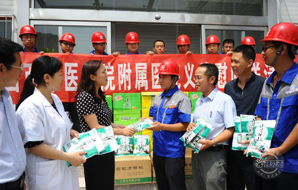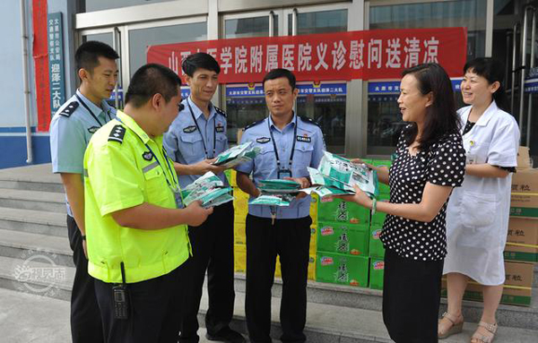 山西新闻网:山西中医学院附属医院义诊慰问送清凉 发布时间:2016年7月28日 来源:山西新闻网 作者:新闻头条 山西中医学院附属医院的志愿者为坚守在交通岗位一线的民警送上了医院自制的解暑保健茶、解暑药等物资。 志愿者为中铁三局太原地铁2号线工程项目部的建设者们带去了医院自制的解暑保健茶、解暑药等物资。 医务人员为民警现场免费贴三伏贴,并详细回答了大家的疑问。 为民警免费贴三伏贴。