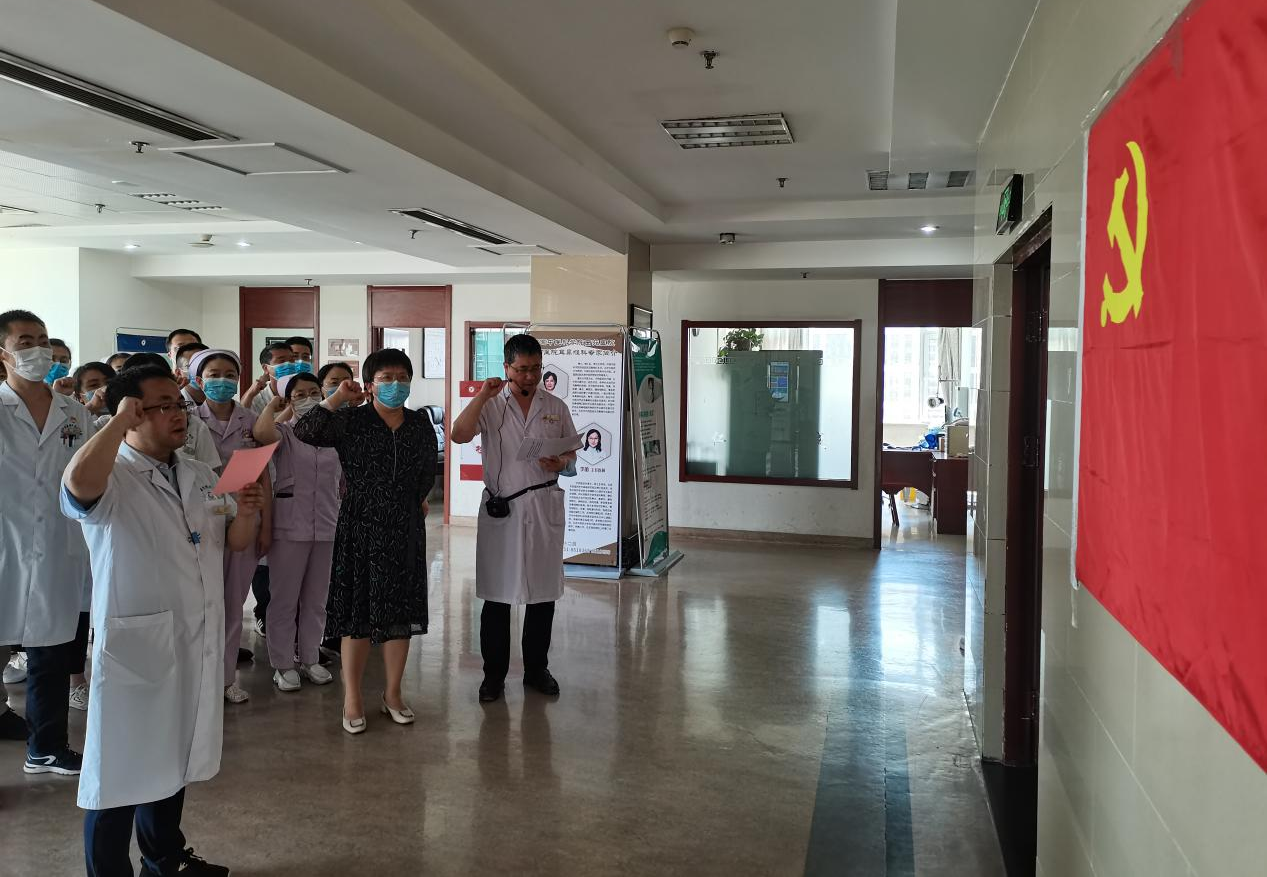 活动现场,临床六支部书记张志斌带领支部党员们面向党旗,高举右手,重温入党誓词。庄严的誓词、铿锵的声音让党员们热血沸腾,激情澎湃,更加坚定了为党的事业奋斗终身的决心和信念。