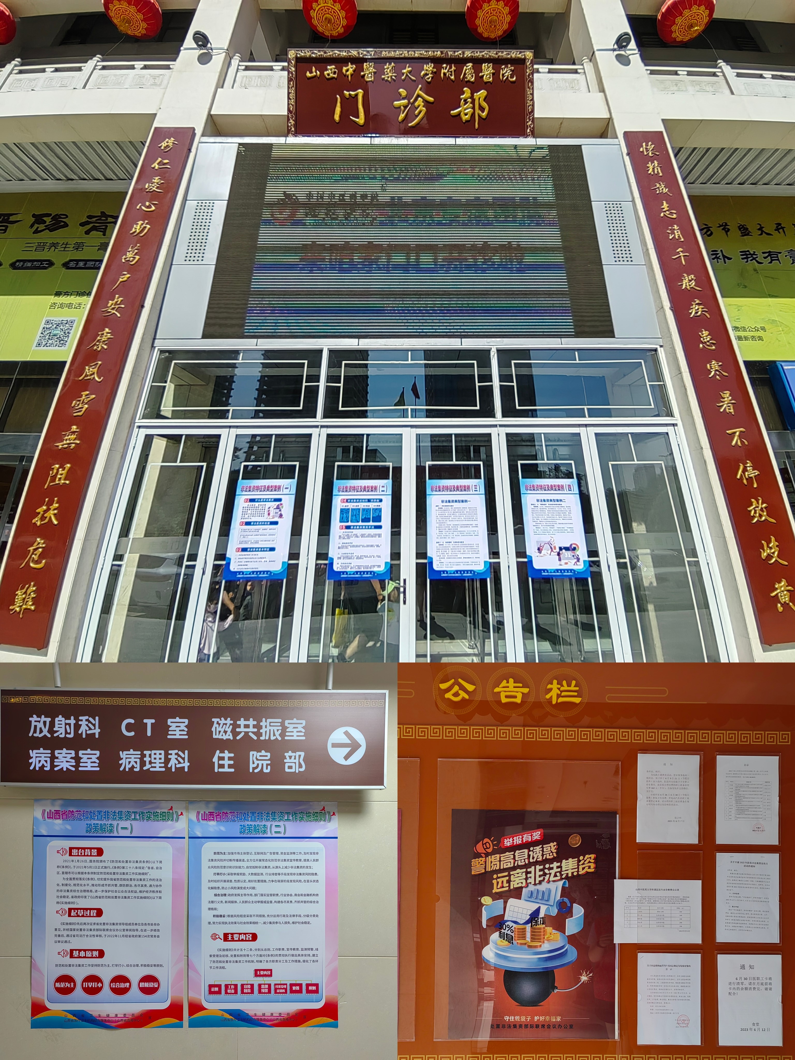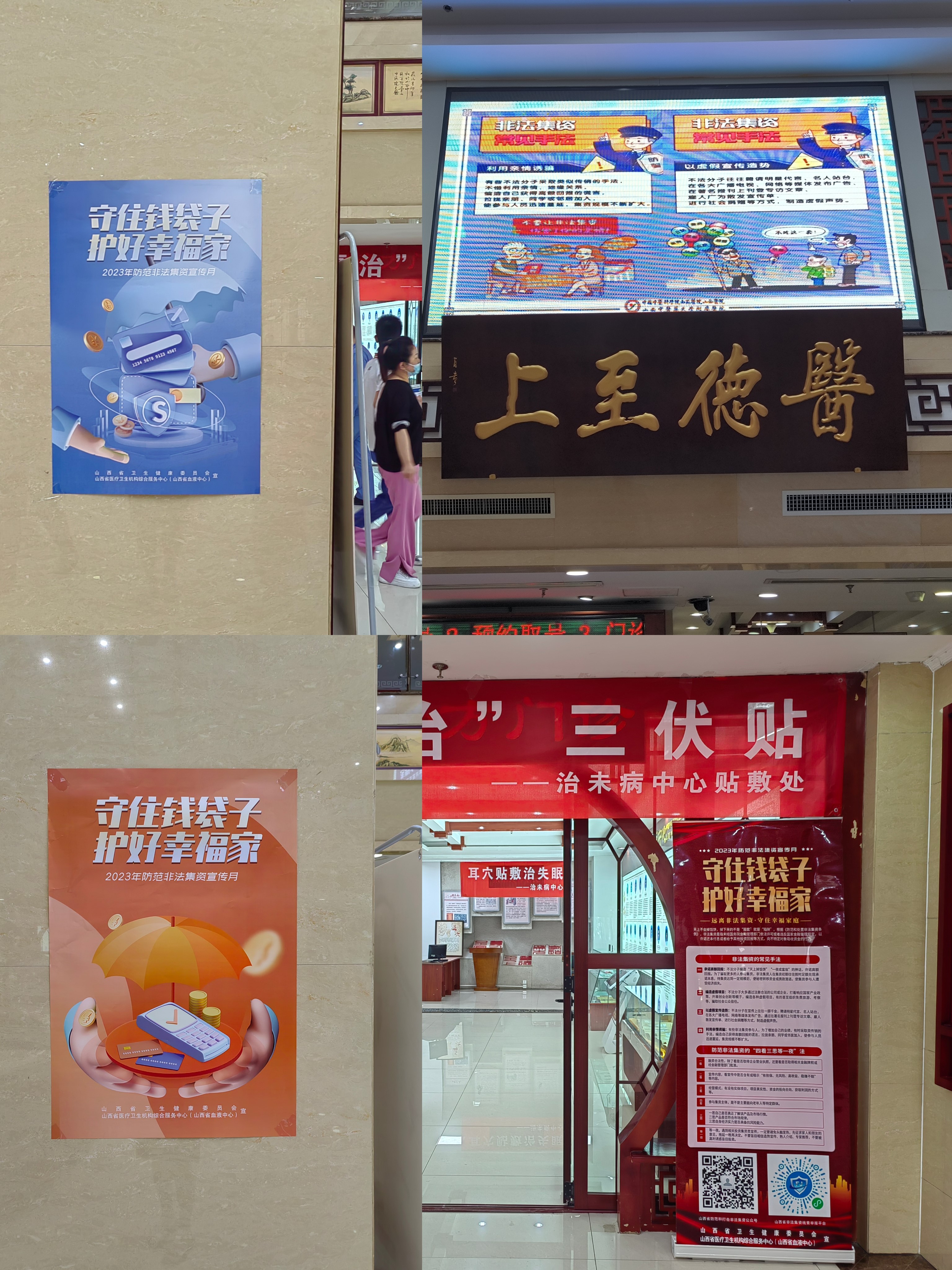 为营造浓厚的宣传氛围,在门诊楼导诊台放置了防范非法集资宣传的易拉宝,在电梯、公告栏、指引牌处以及医院门口张贴相关政策解读和典型案例等宣传海报,并在医院大厅的大屏幕上播放非法集资常见手段的宣传片,在院内院外开展了全方位的宣传活动。