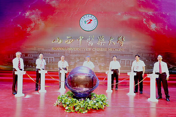 周然、王志勇、张伯礼、李凤岐、张俊龙、马存根、李青山共同为山西中医药大学揭牌。