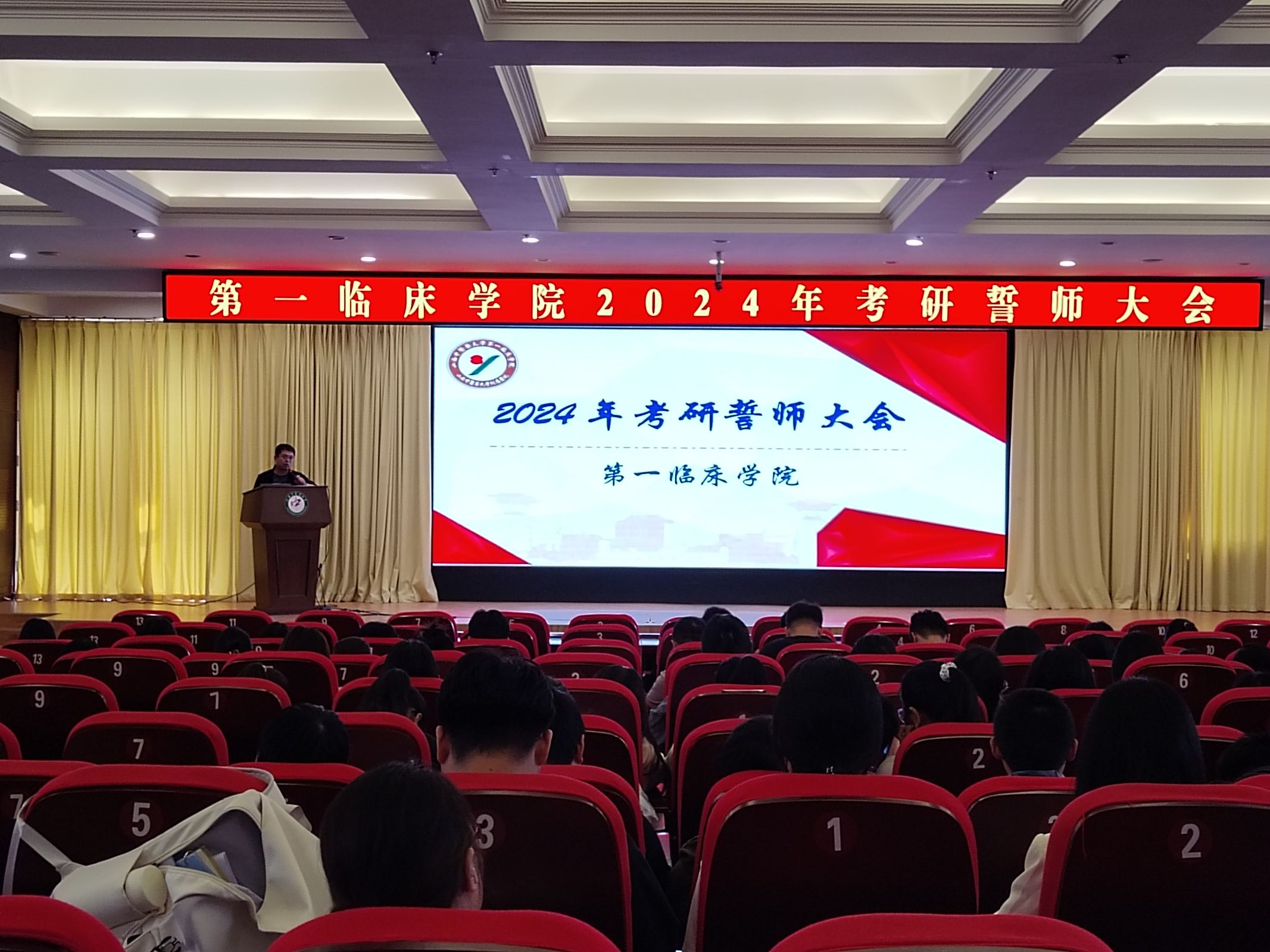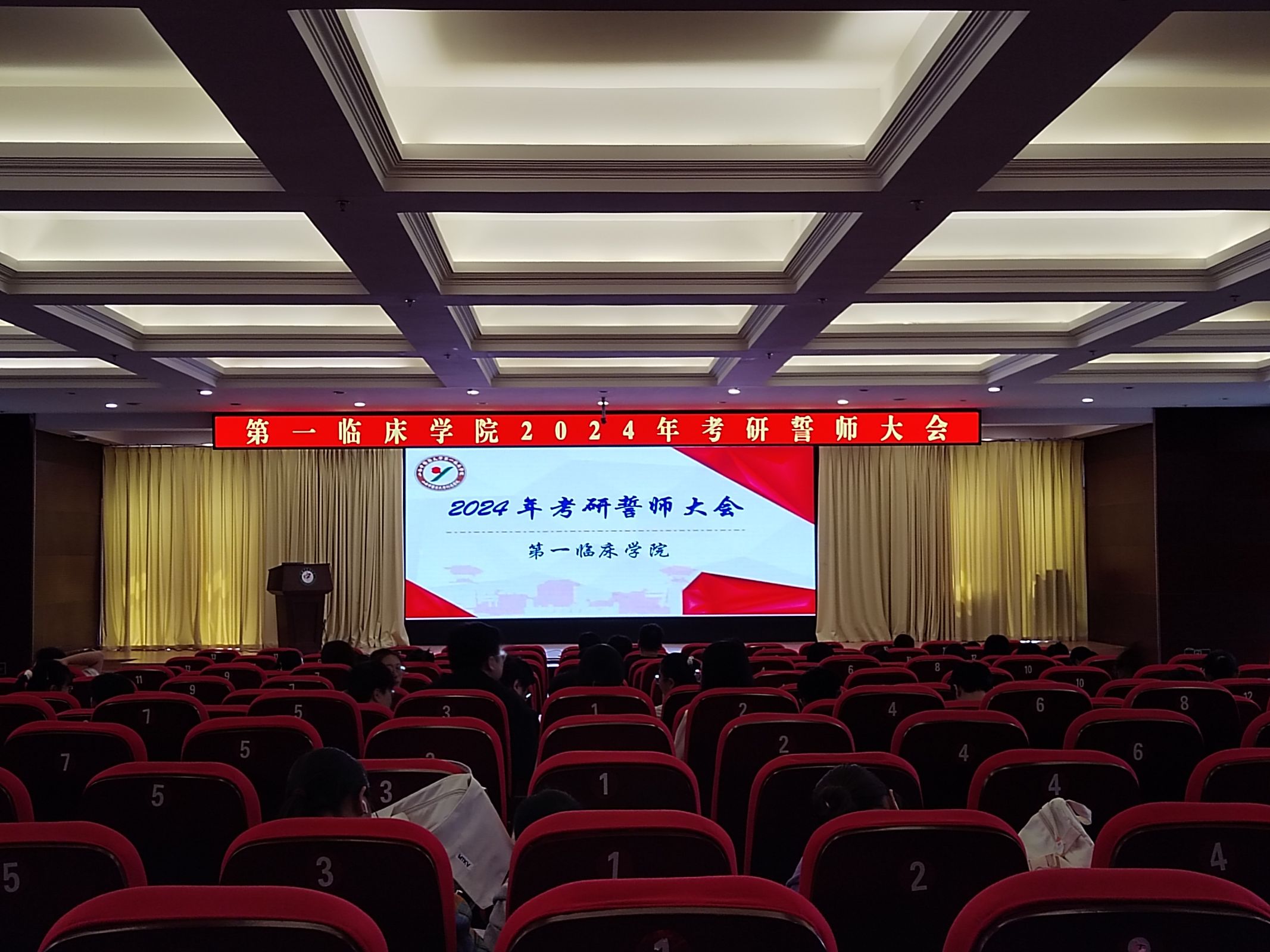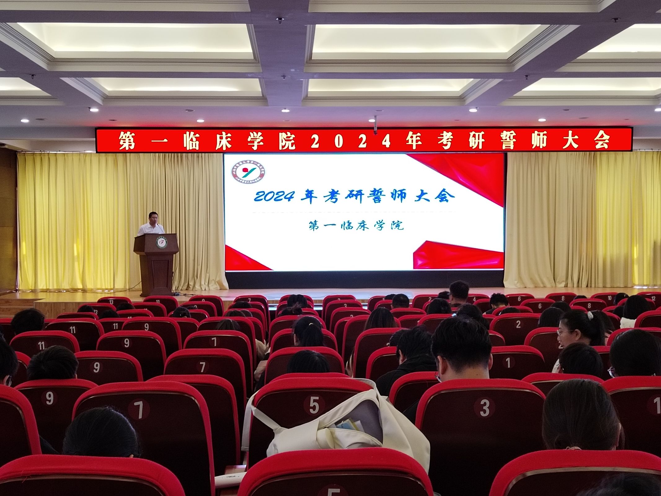 为进一步做好考研服务工作,增强学生的考研决心和信心,9月20日下午,第一临床学院在图文信息报告A厅举办了2024年考研誓师大会。第一临床学院党委副书记任剑锋,研究生院招生就业科科长解燕飞老师出席,会议由学生科科长赵国鹏主持,辅导员老师和19级1-7班全体同学积极参会。
