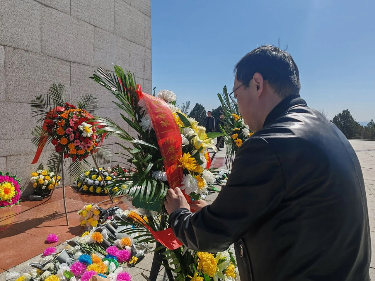 在狮脑山的广场上,劲松傲立,绿茵铺陈,镌刻着“战绩辉煌永垂史册”的百团大战纪念碑肃然矗立,静静诉说着往昔的烽火硝烟。全体同志整齐列队,庄严肃立,向烈士纪念碑敬献鲜花并默哀,致以最深切的追思。
