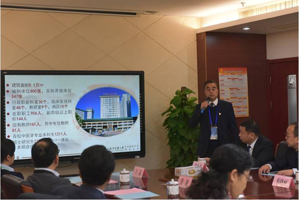 在十五层会议室里,党委书记夏耀林代表全院教职工对专家组莅临指导工作表示热烈欢迎。院长李廷荃从基本情况、教学工作、教学保障、努力方向四个方面就中医临床学院(附属医院)本科教学工作作了汇报。李院长首先介绍了学院和医院的艰难发展历程,他强调,要以学院凝练出的“12334”教学方针为主线,以厚基础、强能力、抓质量、重特色为目标,使中医临床学院与附属医院不断深化融合;要更新教学理念、完善质量监控体系,做到医、教、研协同发展;要继续加大医疗教学基础设施投入,规划建设中医综合实训大楼和康复养生基地,继续采用引进来、走出去的办法提高师资队伍水平,培养出更多高水平的中医学专业人才。