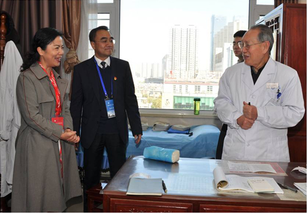 专家组一行先后参观了中医药文化主题公园“悦心园”、全科医师规范化培训基地及门诊大厅。在八层名医堂拜访了国医大师王世民、全国名中医贾六金、全国教学名师李晶、门氏杂病流派传承人门九章。所到之处,刘志宏教授都亲切问候了这些老专家、老教授,并语重心长地告诉在场学习的学生们要珍惜机会,好好向中医前辈们学习。随后参观了医院针灸、推拿科。